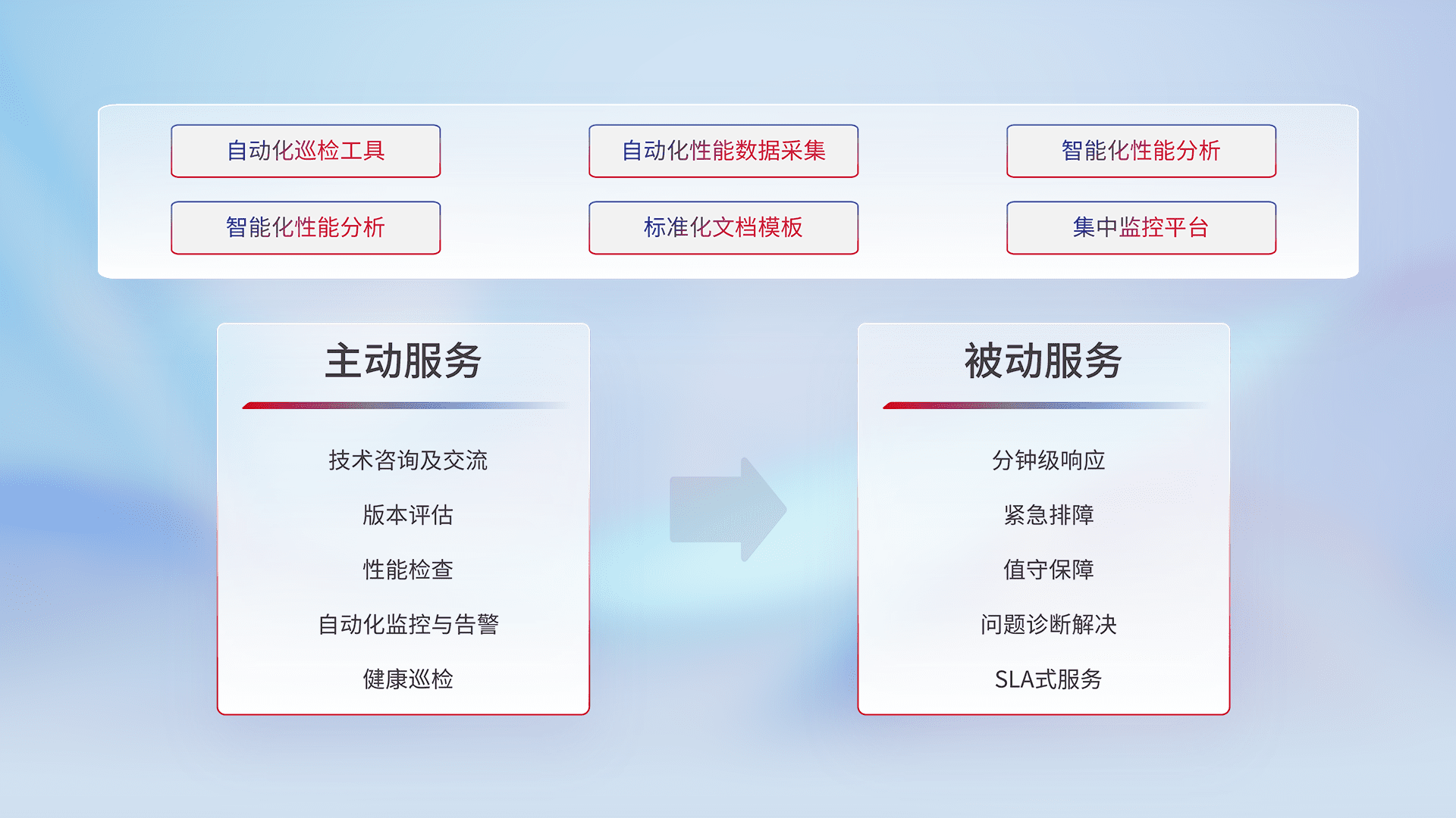 智能化工具和标准化文档,,,,保障服务质量,,,,提供主动服务(包含技术咨询、、版本评估、、、、性能检查、、自动化监控与告警、、、健康巡检)和被动服务包含(分钟级响应、、、、紧急排障、、、值守保障、、问题诊断解决、、、、SLA服务)。。。