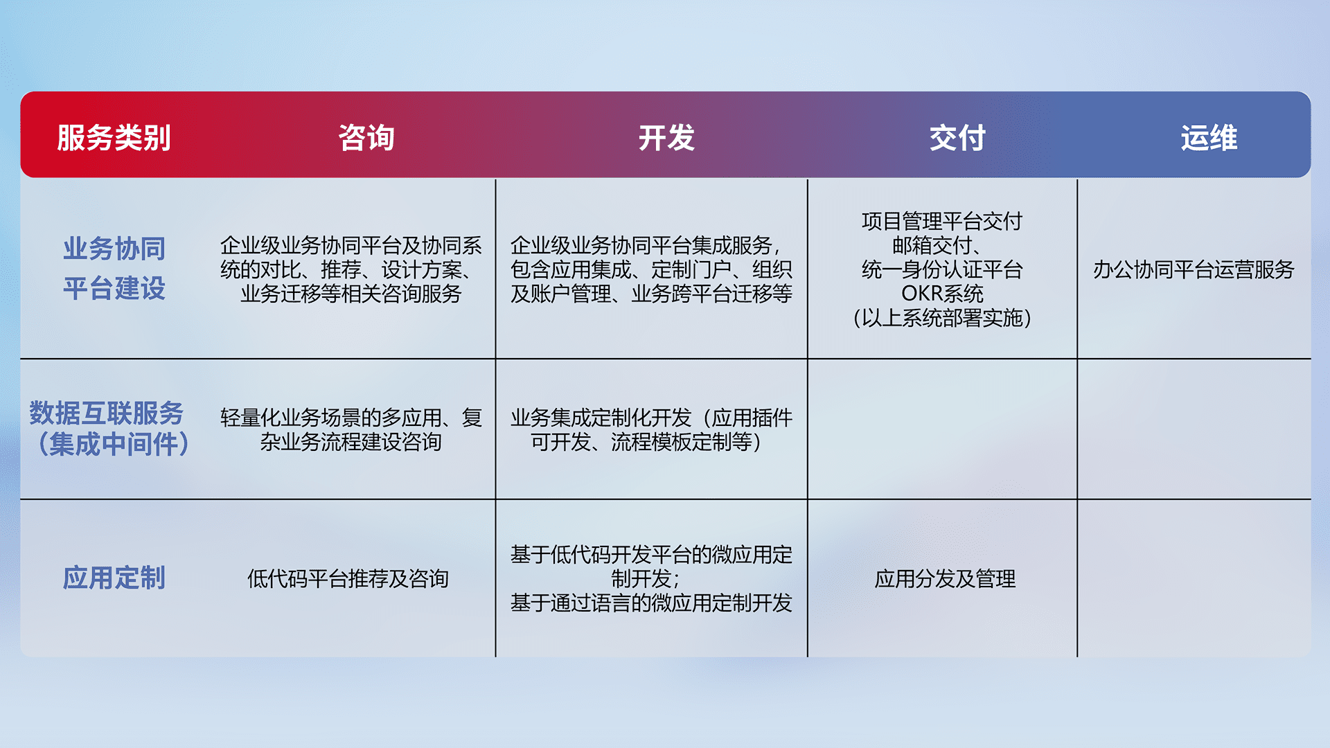 针对钉钉、、、企微、、、IDaas等平台级产品提供产品的规划、、方案、、、交付、、定制化开发等服务,,,,实现如统一协同办公、、、智能客户服务、、、、混合会议管理、、智能数据查询、、、等业务场景,,实现数字化转型。。。
